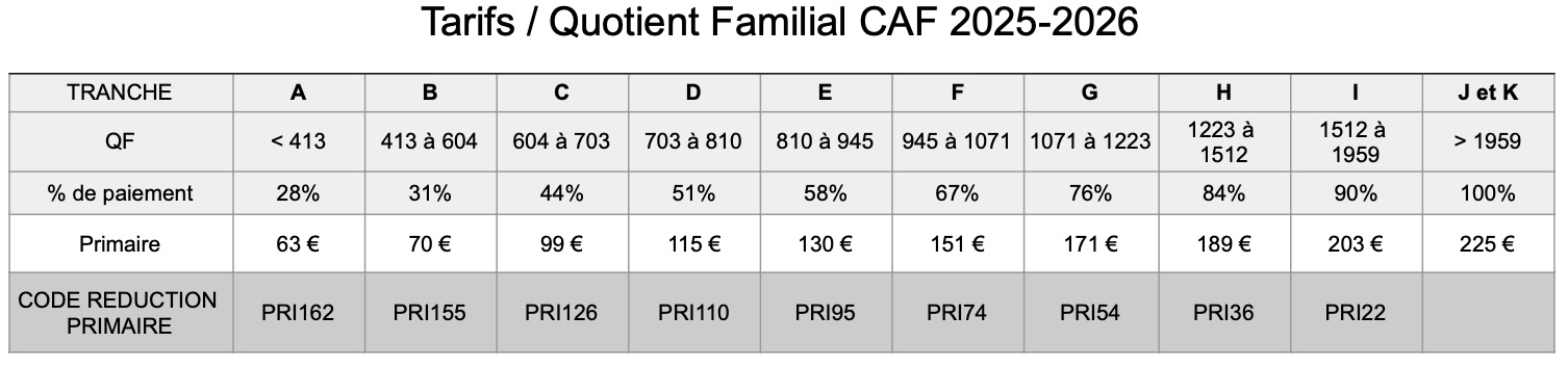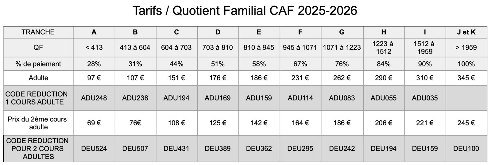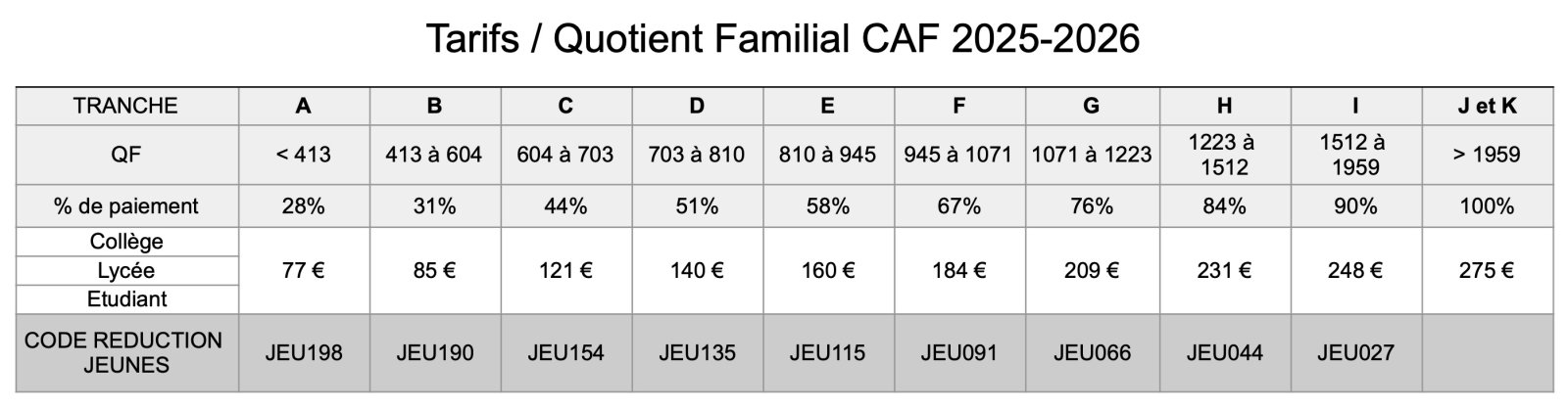 Si vous bénéficiez d'une réduction liée à votre quotient familial, vous trouverez ci-dessous les codes de réduction à rentrer en fonction de votre situation.